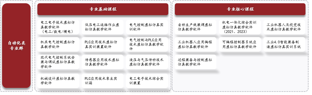 通過專業(yè)基礎(chǔ)課、專業(yè)核心課、專業(yè)拓展課的延伸拓展,提供圍繞自動控制相關(guān)基礎(chǔ)理論、核心能力及擴展應(yīng)用的課程內(nèi)容,通過軟件及資源、硬件設(shè)備和工程實訓(xùn)的體系,為教學(xué)提供全方位支撐。